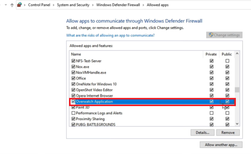 - 搜索“Overwatch”并确保规则已启用并允许。