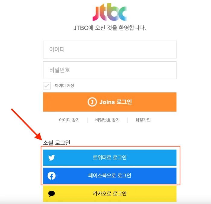 从PC访问JTBC登录屏幕后,请在社交媒体上创建一个新帐户。