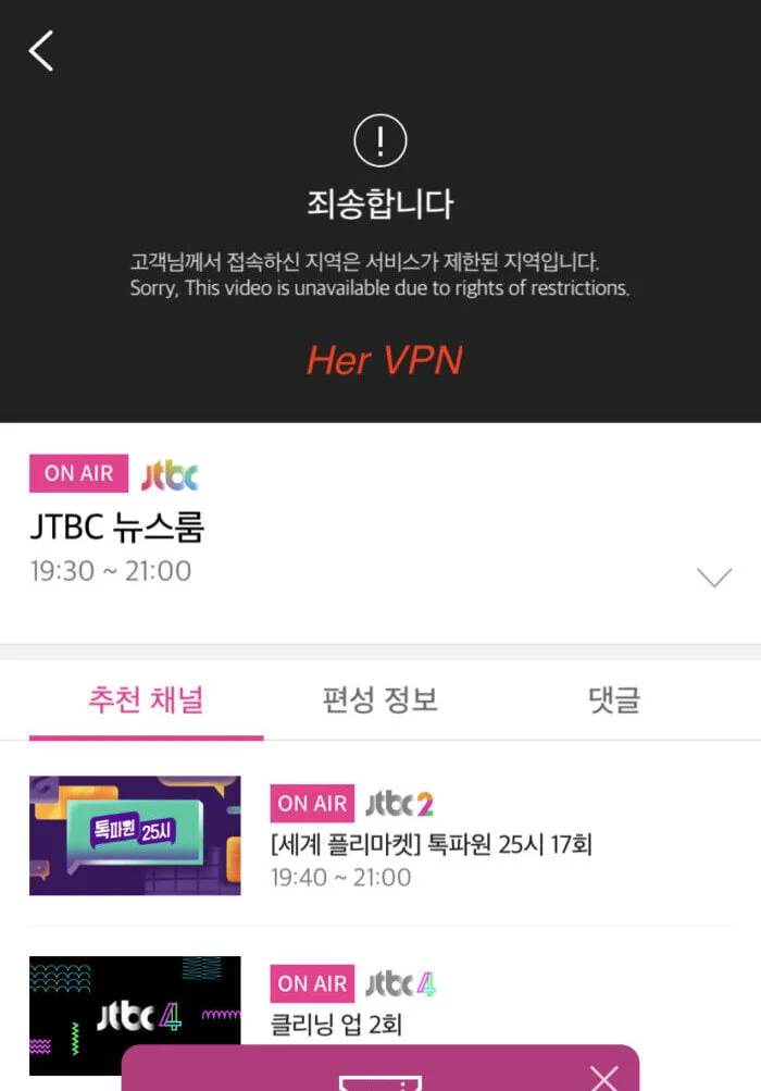 即使您在没有VPN的情况下连接到JTBC,它也会被阻止,因此您无法观看它。