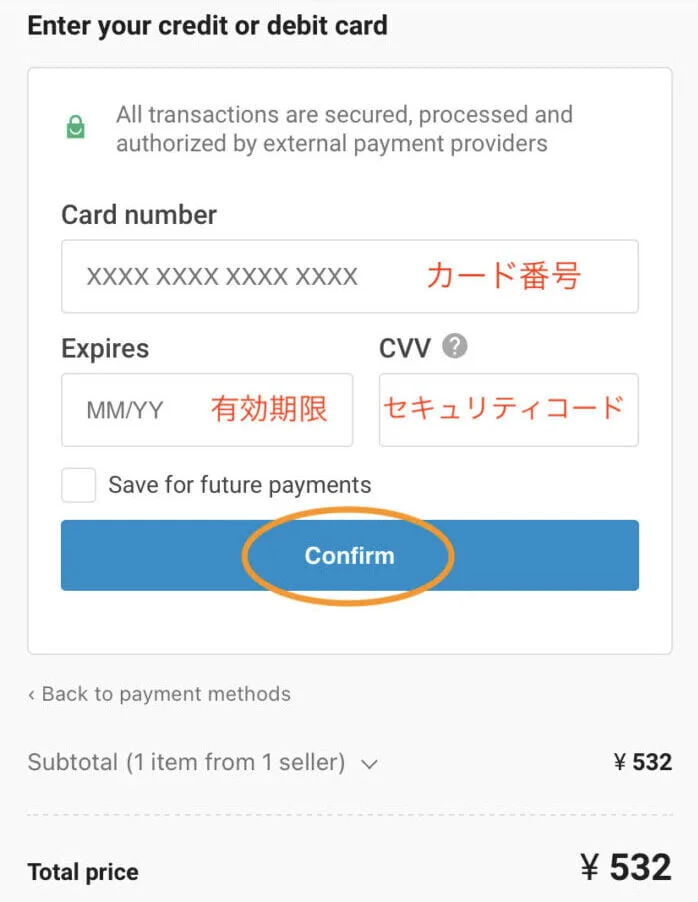 输入您的信用卡号码确认(付款)点击。