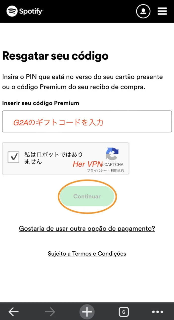 这里输入在 G2A 购买的巴西 Spotify Premium 礼品代码我会。