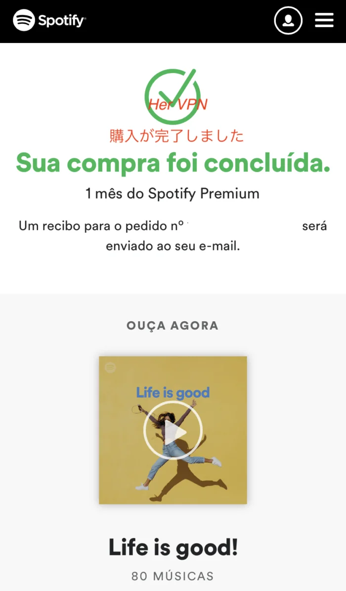 Sua compra foi concluída 当显示“购买完成”时已完成 Spotify Premium 注册是。