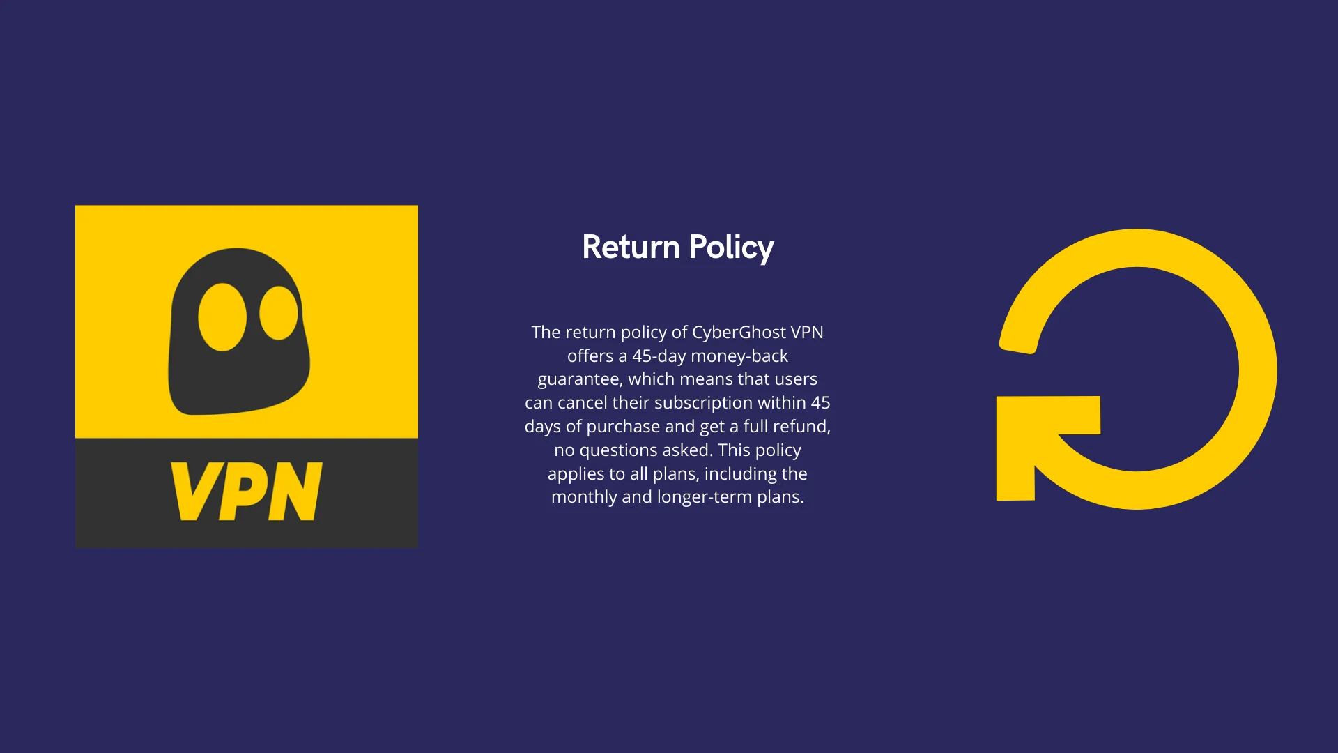 - Cyberghost VPN的退款保證最多可在購買後45天。